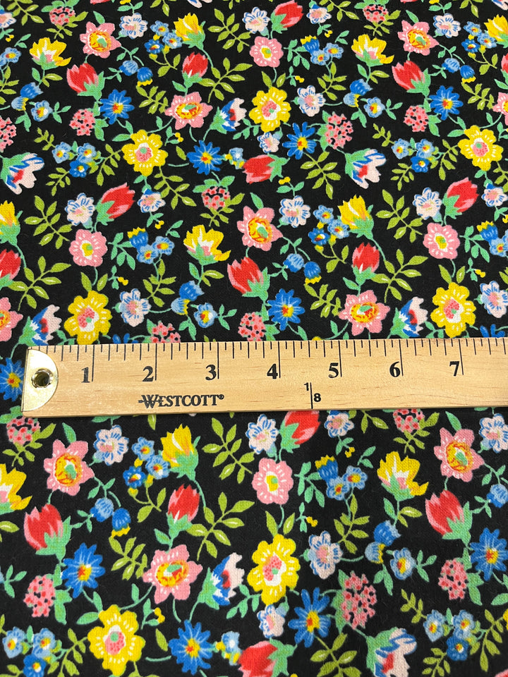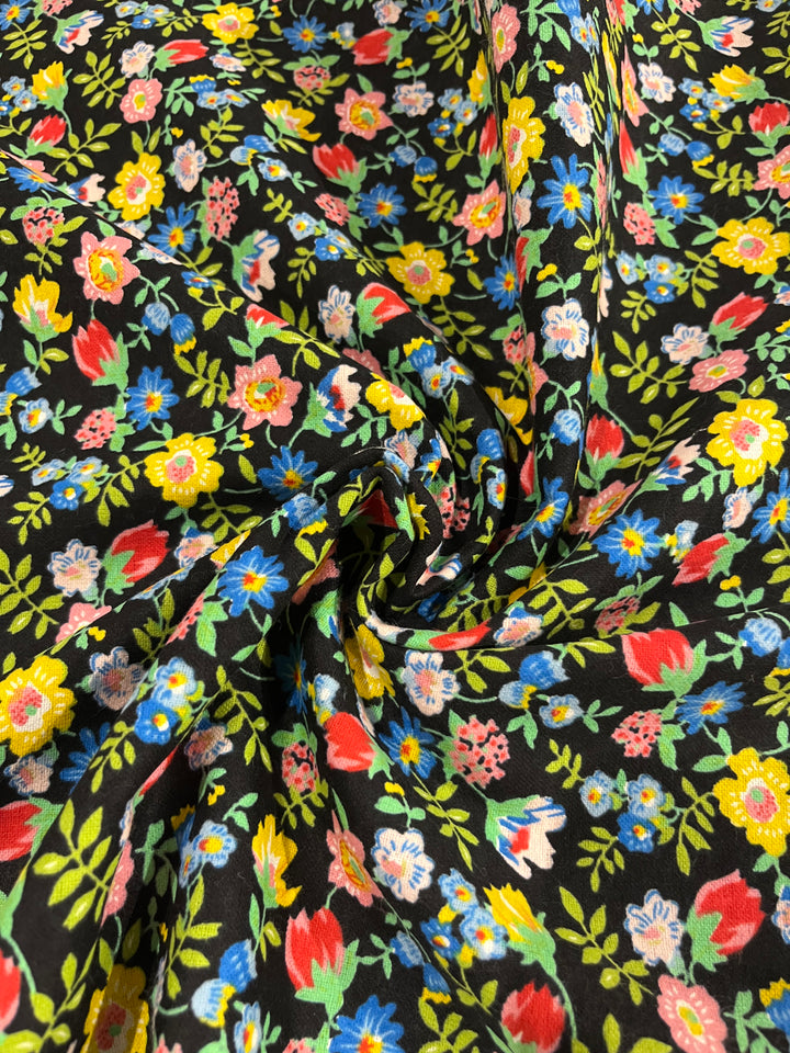 Floral flannel-black background with bright colored flowers. 100% cotton, 44” wide and $4.99 per yd.