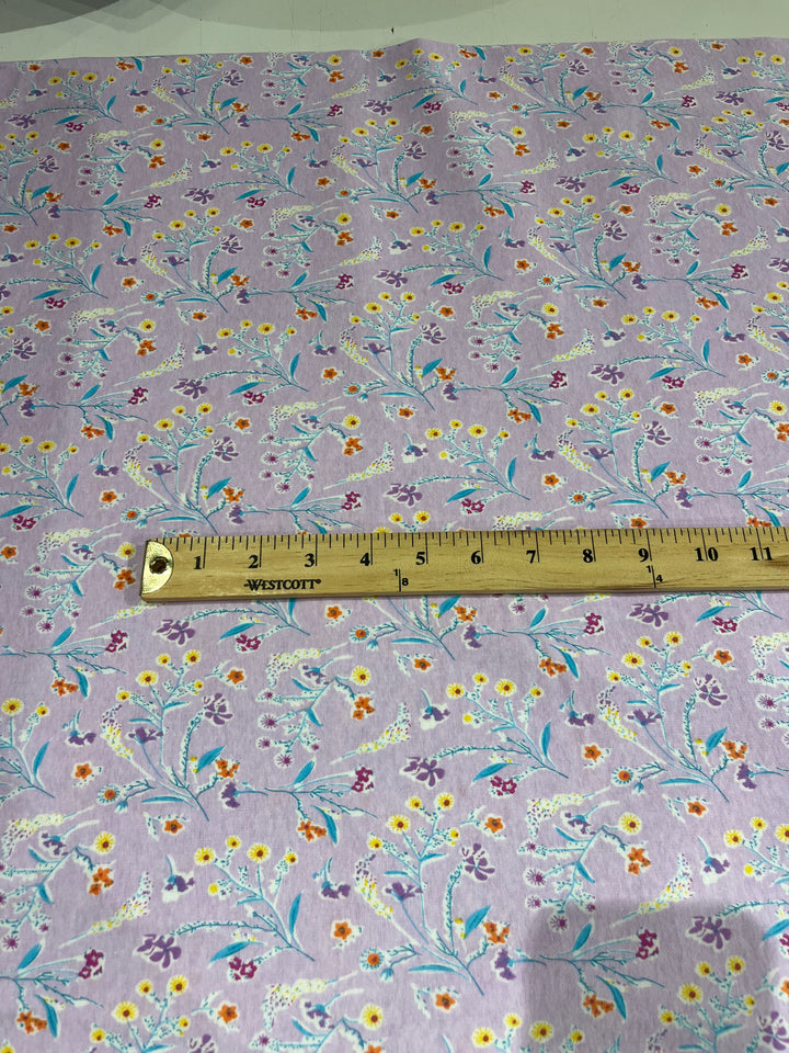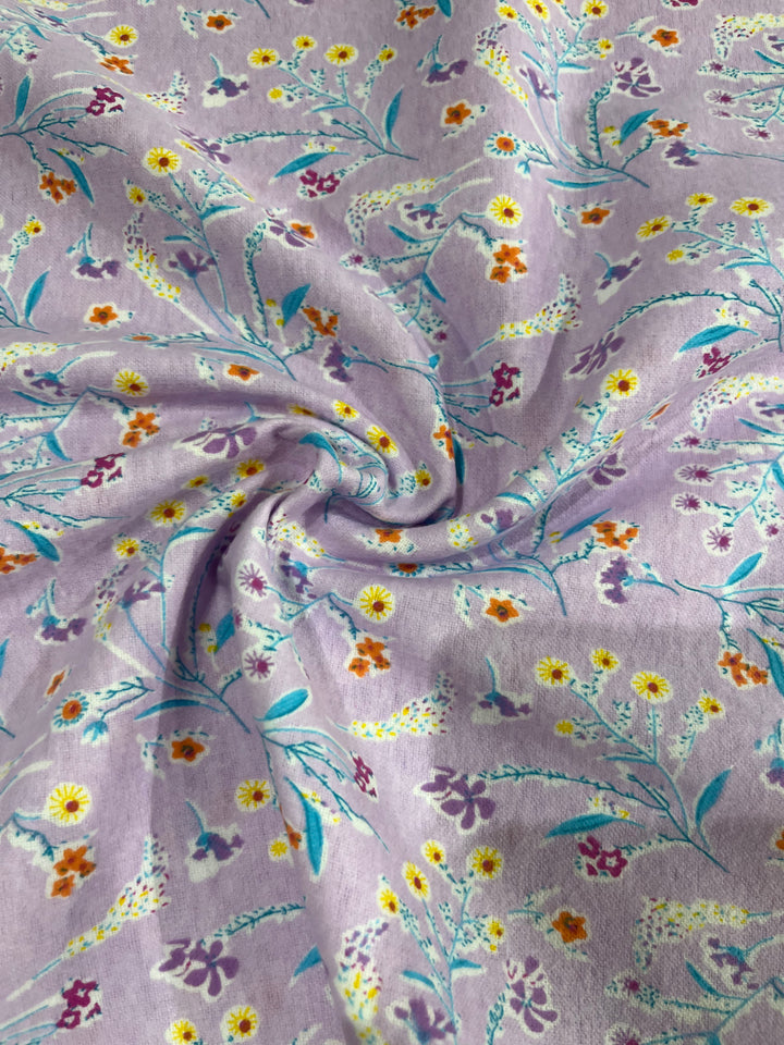 Floral flannel-lavender background with yellow, purple and orange flowers on a teal stem. 100% cotton, 44” wide and $4.99 per yard.