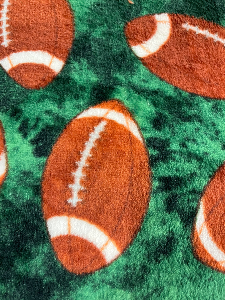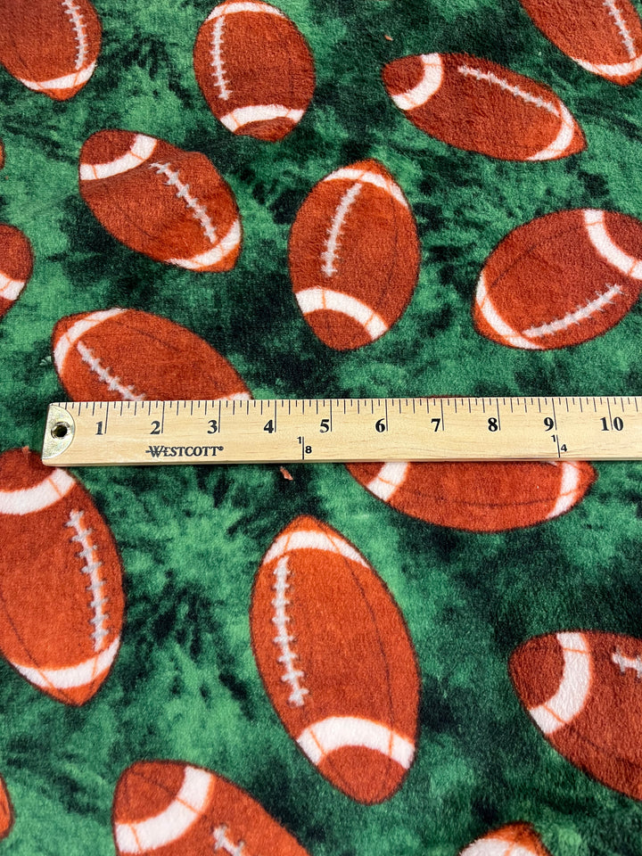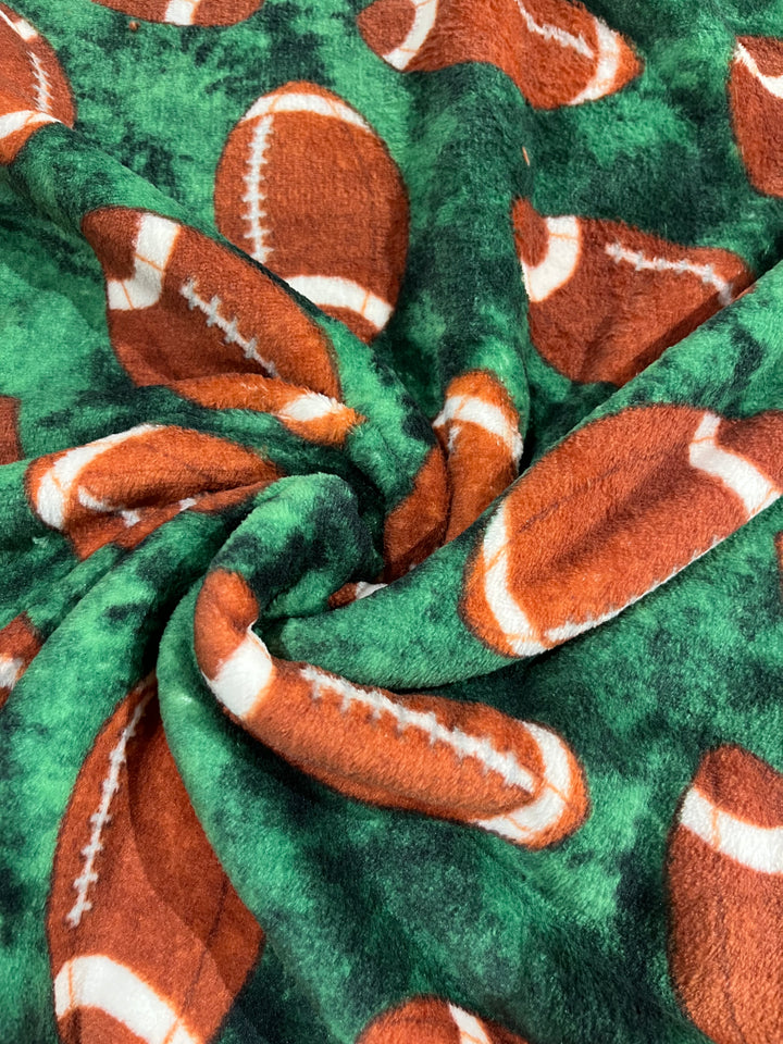Footballs on turf whisper fleece. 100% polyester, 60” wide and $9.99 per yd.