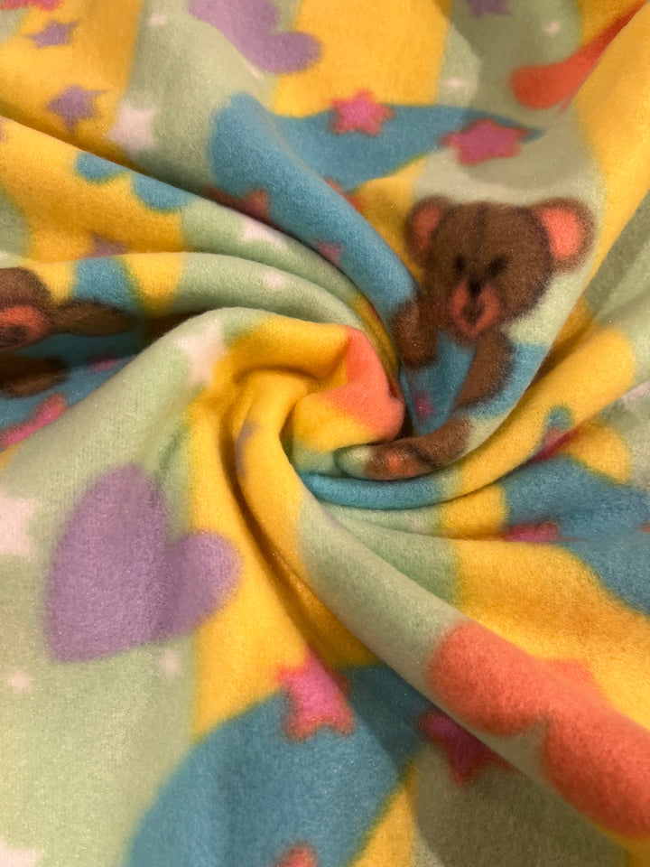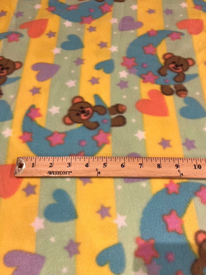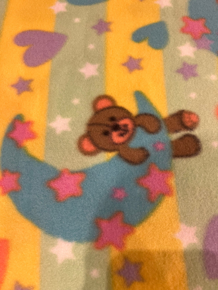 Good night bear fleece. Sherbet colors adorn teddy hanging on a turquoise moon. 60” wide, 100% polyester and $6.99 per yd