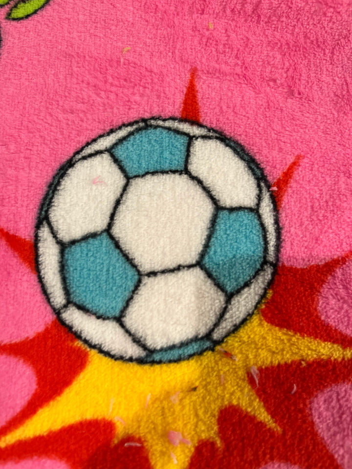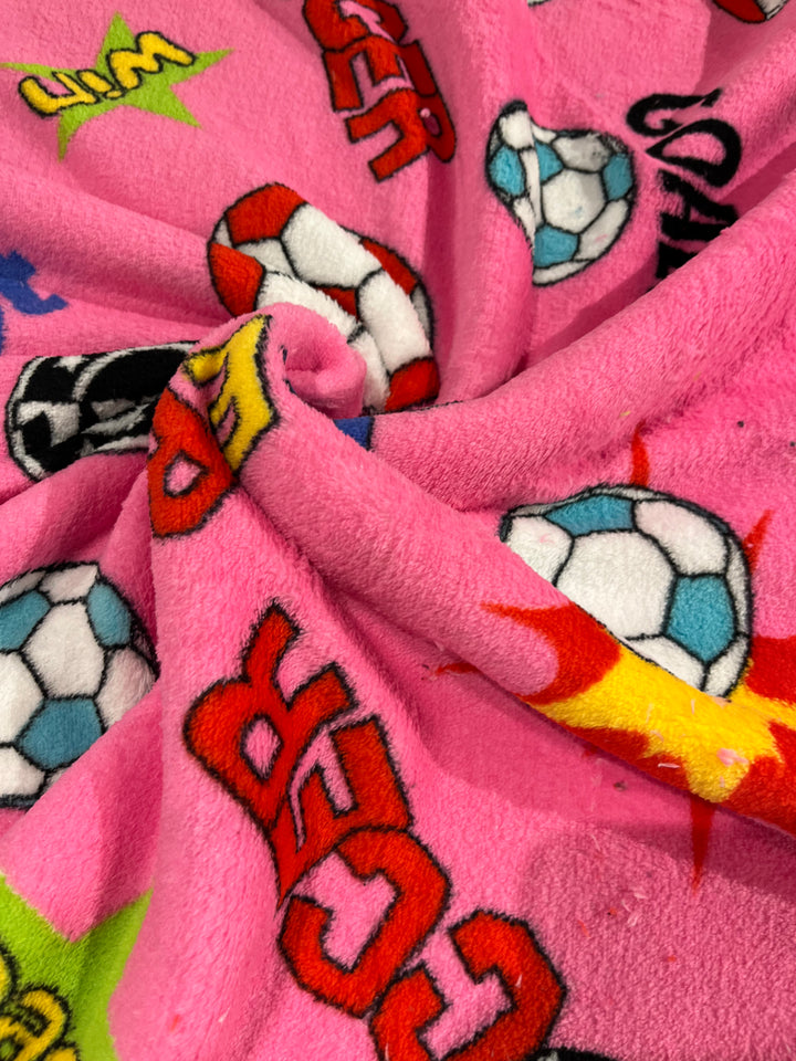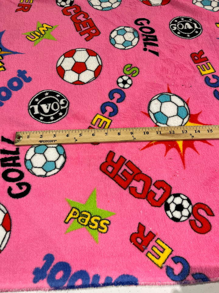 Hot pink soccer themed whisper fleece. 60” wide, 100% polyester and $9.99 per yd