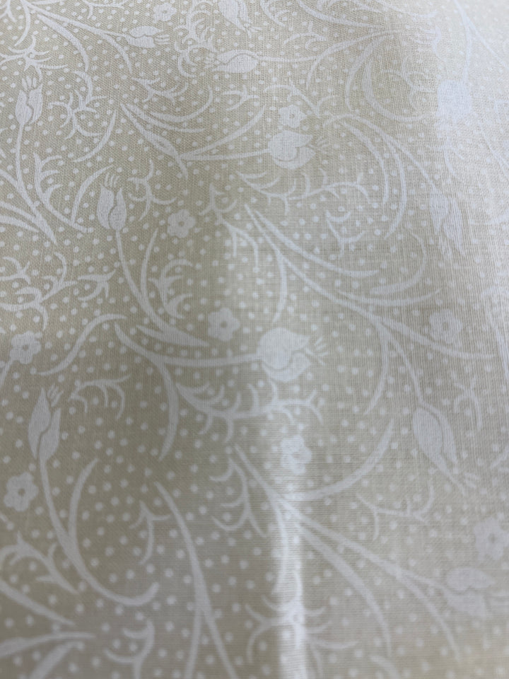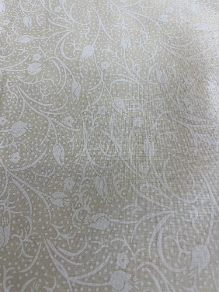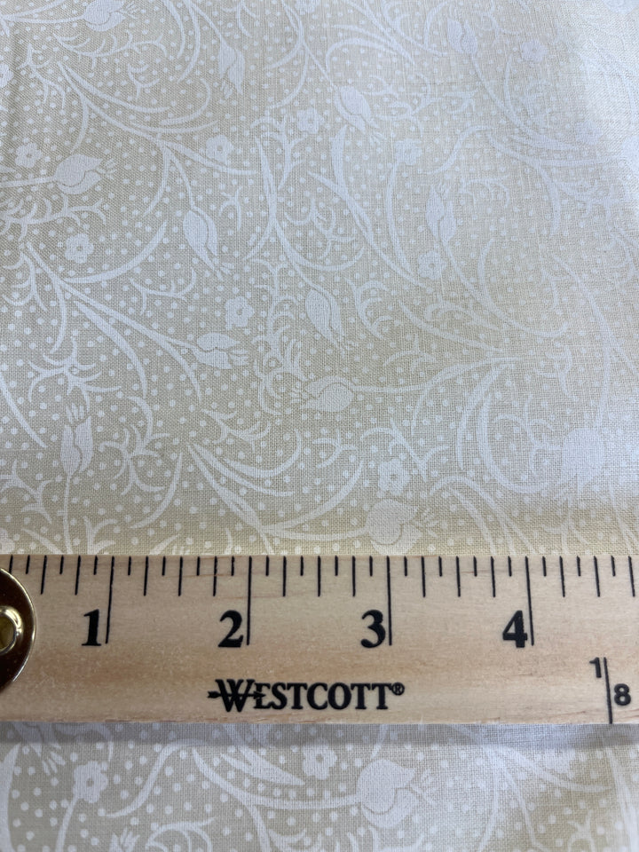 Ivory on ivory floral on vines(i) quilt back. 108” wide, 100% cotton and $9.99.