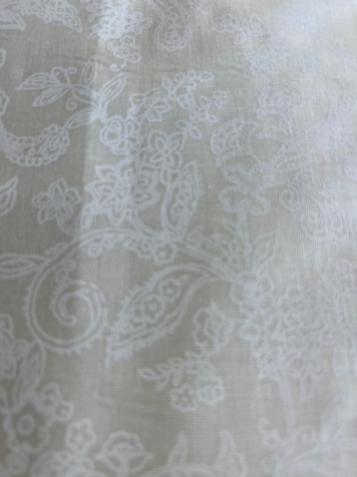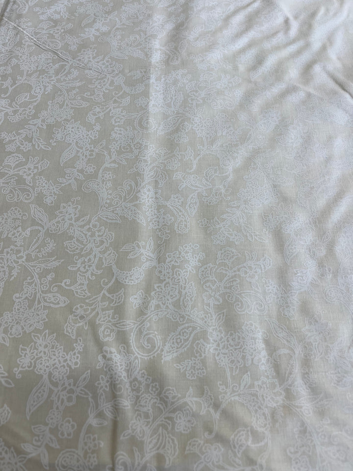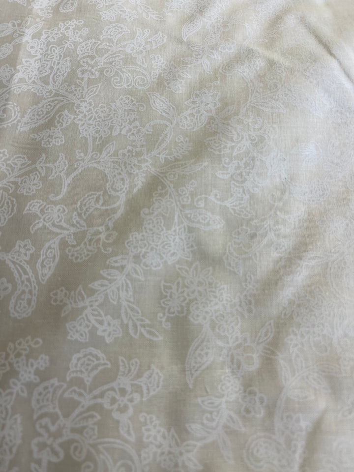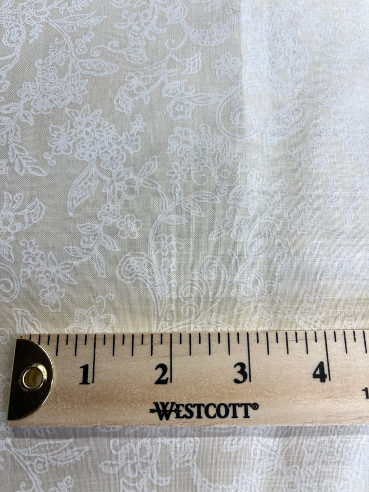 Ivory on ivory floral(h) quilt back. 108” wide, 100% cotton and $9.99 per yd
