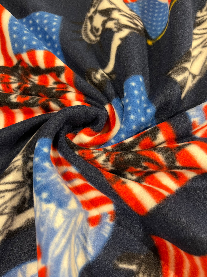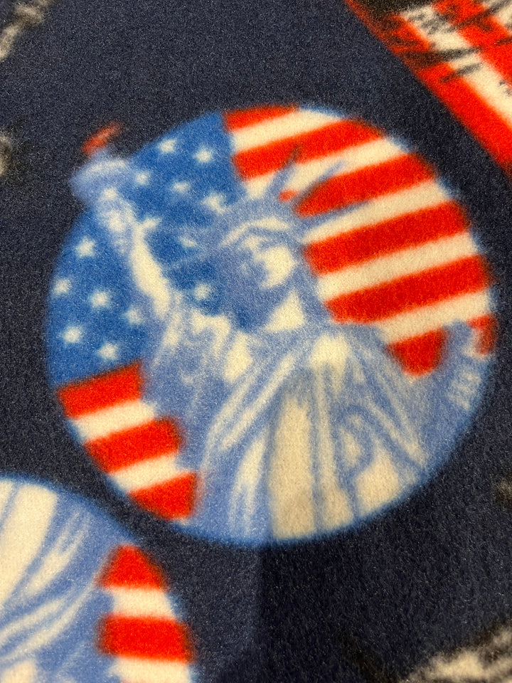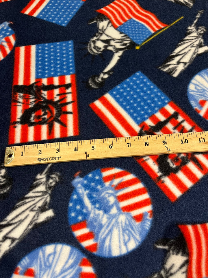 Lady liberty on navy fleece. 60” wide, 100% polyester and $6.99 per yd.