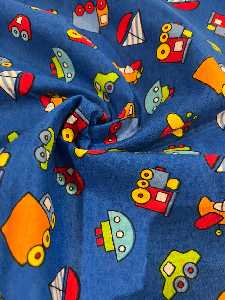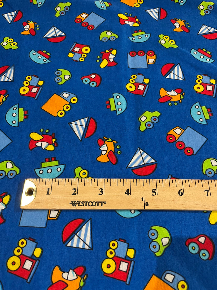 Planes, trains and cars flannel. Royal blue background with planes, trains , cars and boats in primary colors. 100% cotton, 44” wide and $4.99 per yd.