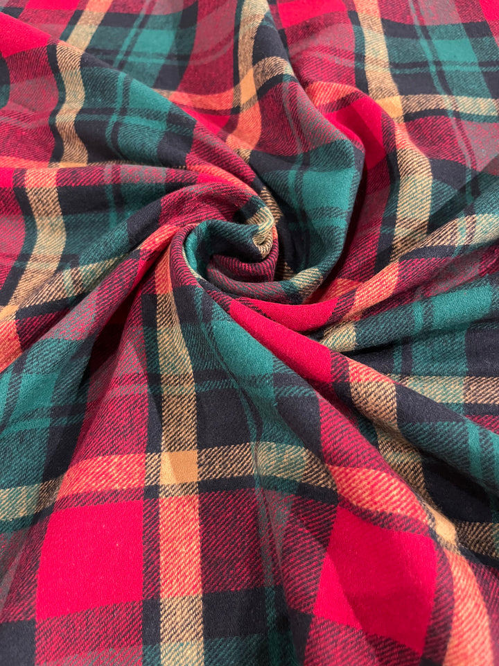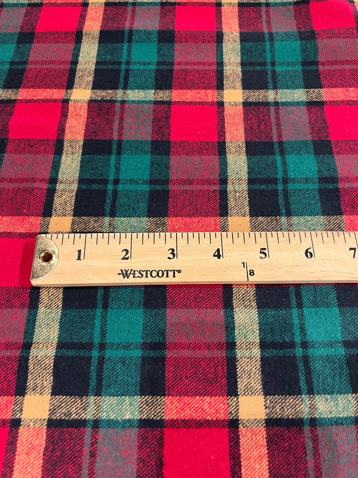 Red, green and yellow plaid flannel. Yarn dyed, 60” wide, 100% cotton and $6.99 per yd.