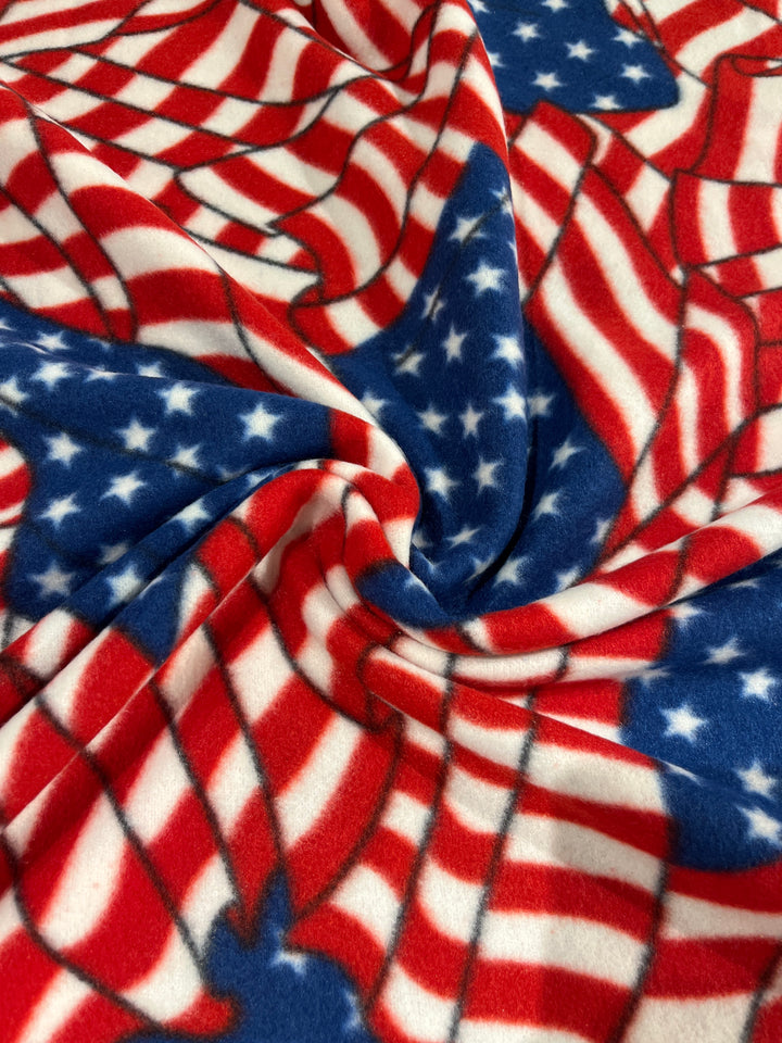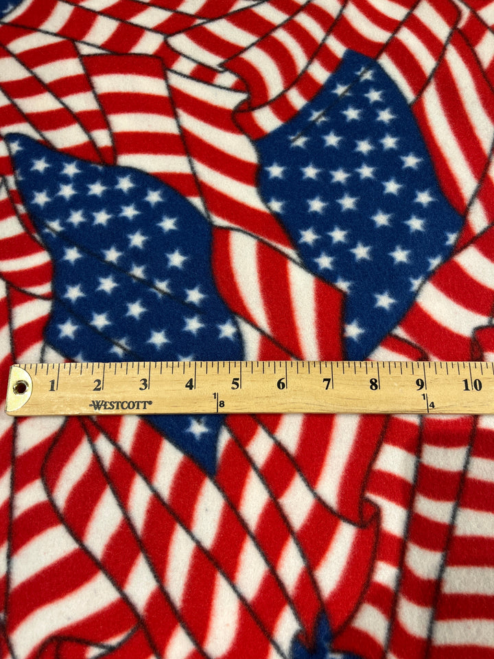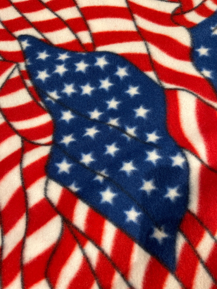 Stars and Stripes forever fleece. 60” wide, 100% polyester fleece and $6.99 per yd.