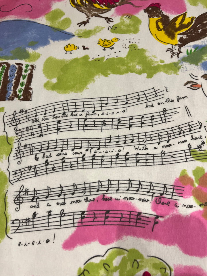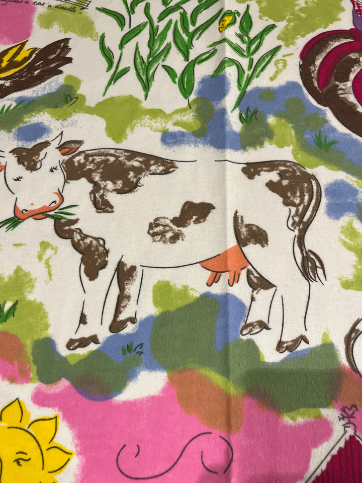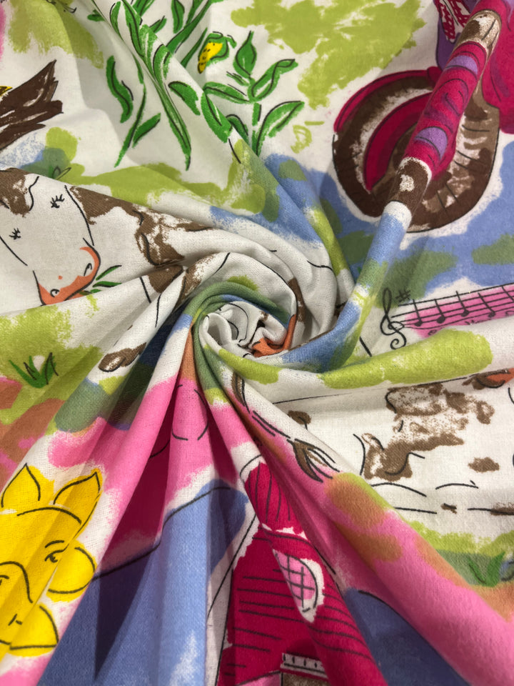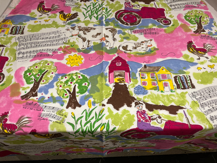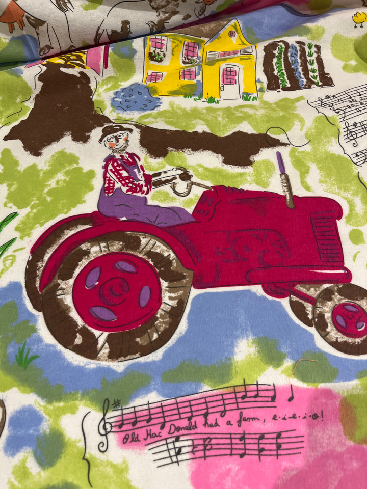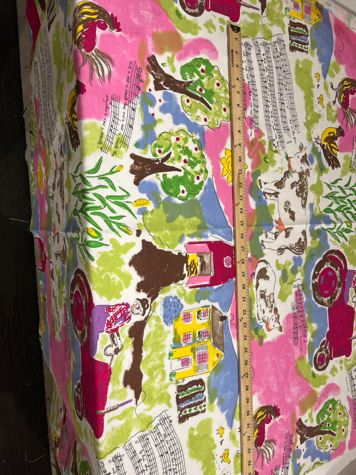 Old Macdonald flannel. Farm scene with pinks. 100% cotton, 44” wide, 25” repeat and $4.99 per yd.