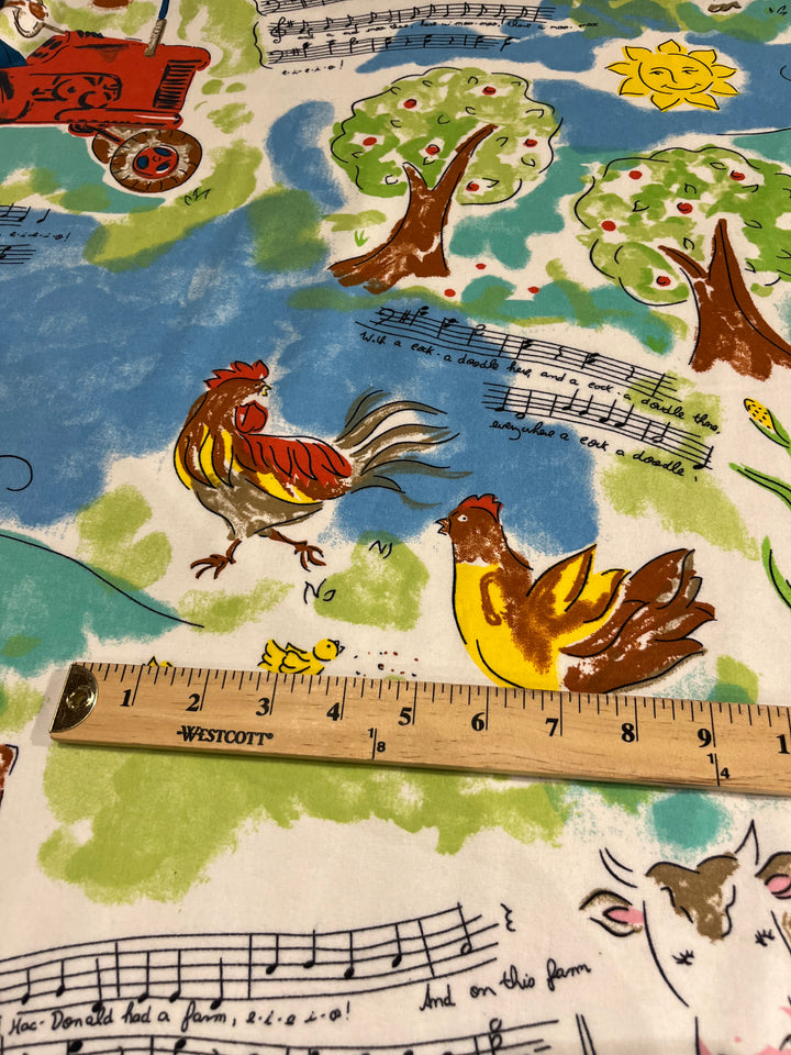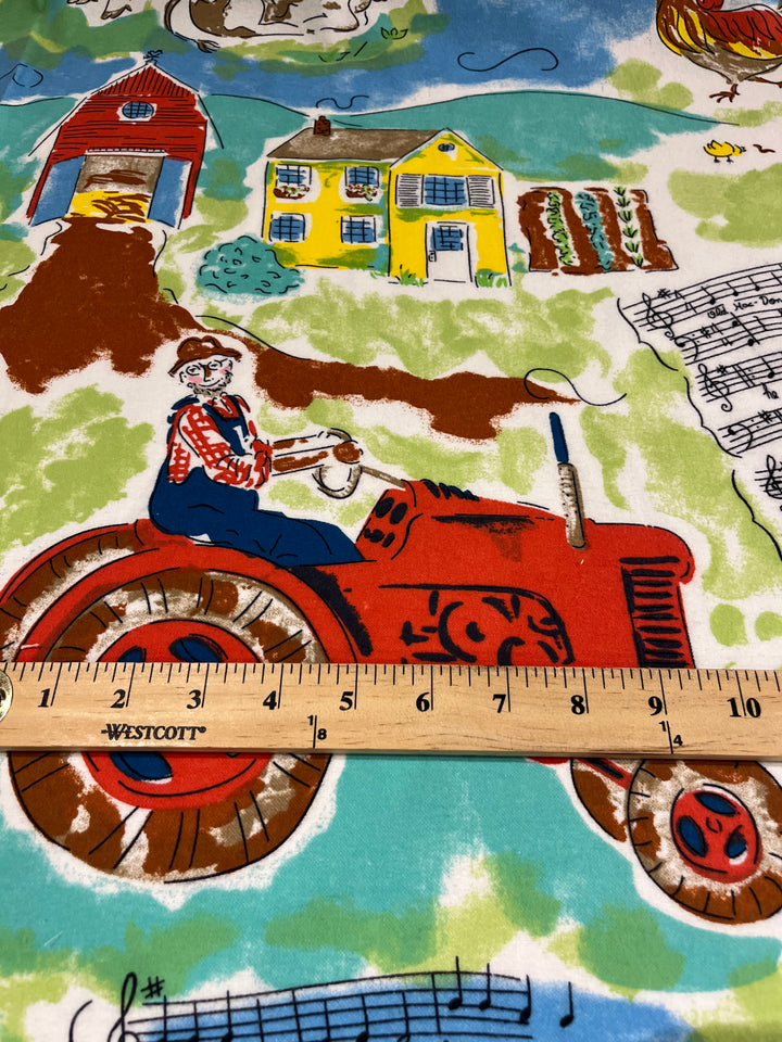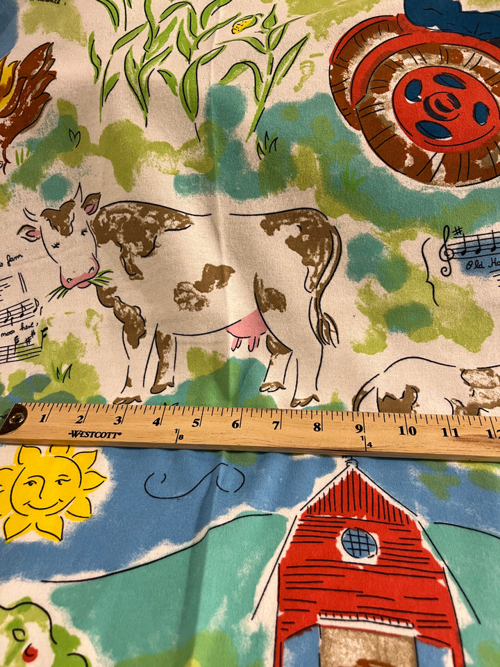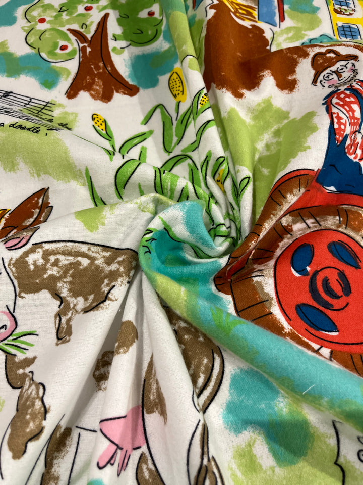 Old Macdonald farm flannel. Farm scene in greens with 25” repeat. 100% cotton, 44” wide and $4.99 per yd.