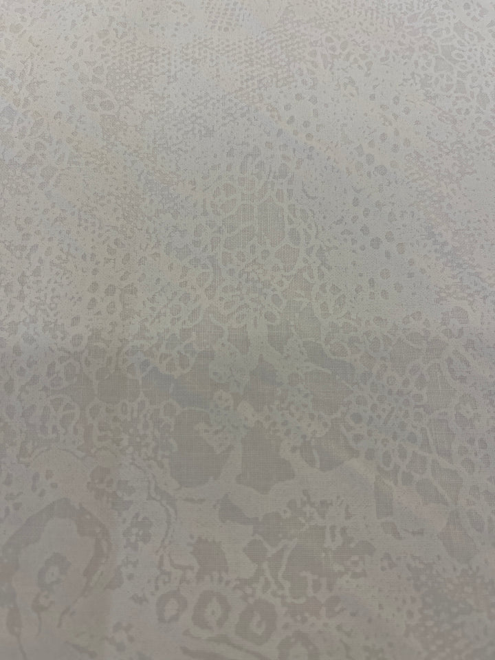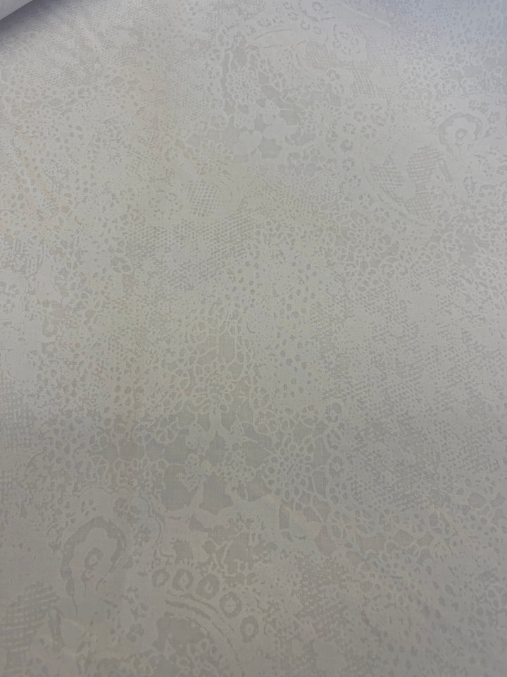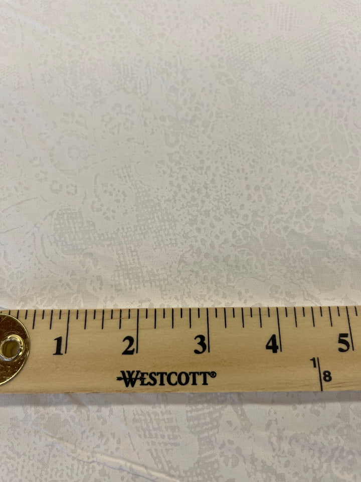 White on white lace(E) print quilt backing. 108” wide, 100% cotton and $9.99 per yd.