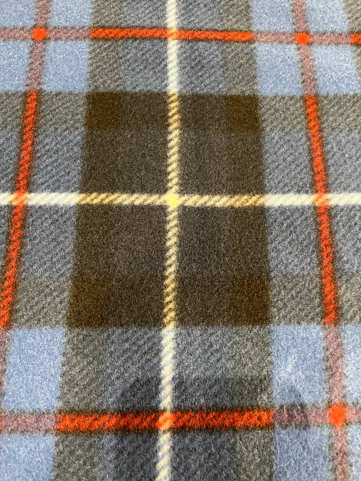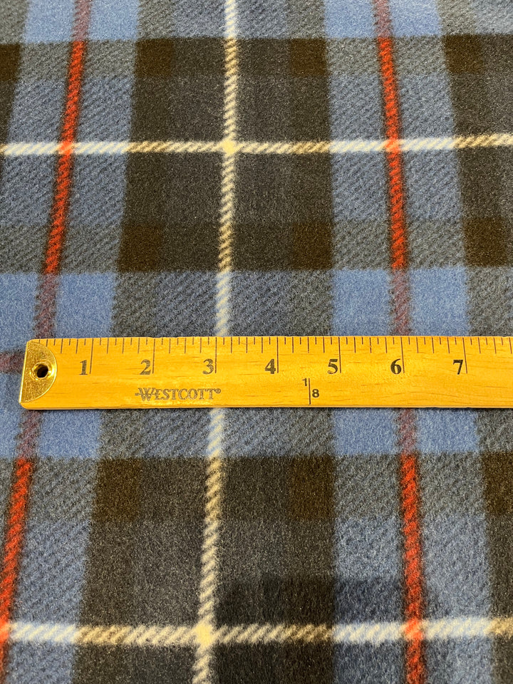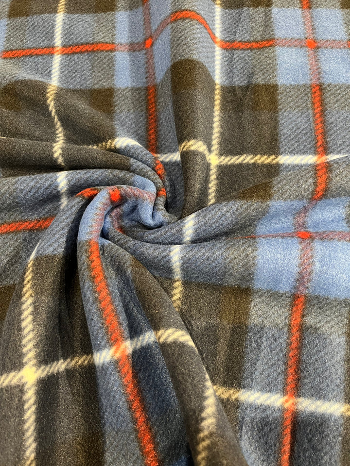 Window pane plaid in royal/navy with white and red accents. 60” wide, 100% polyester and $6.99 per yd